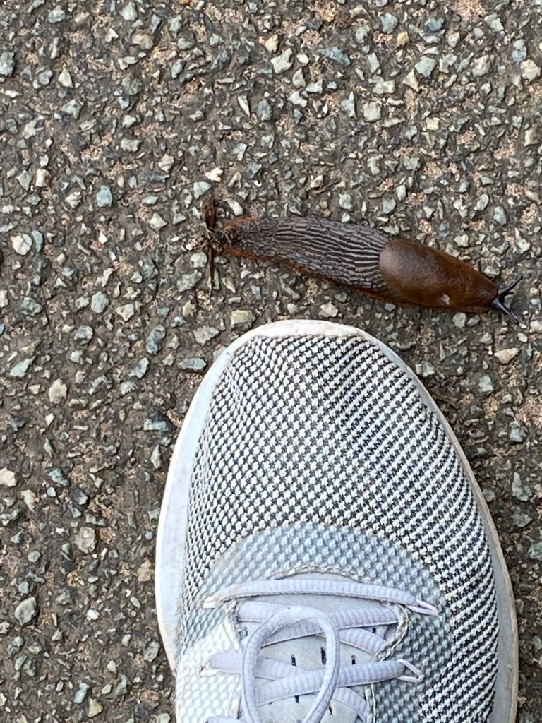 They have giant sized slugs here in the UK. Here’s one I came across while walking this morning, just sliming along on the pavement (AKA sidewalk). Crazy big!!